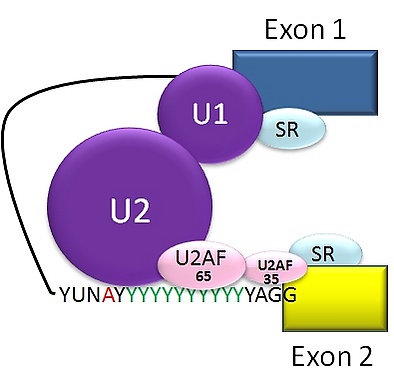 Сплайсинг пре-мРНК осуществляет РНК-белковый комплекс, известный как сплайсосома. В состав сплайсосомы входят малые ядерные рибонуклеопротеиды (snRNP), обозначаемые U1 (РНК), U2 (РНК), U4 (РНК), U5 (РНК) и U6 (РНК) (рибонуклеотид U3 в сплайсинге мРНК не участвует)[23][27]. Рибонуклеотид U1 связывается с 5'-концевым динуклеотидом GU, а U2, при участии белковых факторов U2AF, связывается с точкой ветвления (на этой стадии комплекс называется сплайсосомный А-комплекс). Во время формирования А-комплекса определяются 5'- и 3'-границы удаляемого интрона, а также концы экзонов, которые должны быть оставлены[5] .