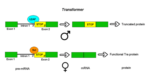 Пре-мРНК гена Transformer (Tra) D. melanogaster подвергаются альтернативному сплайсингу по модели альтернативных акцепторных сайтов. Ген Tra кодирует белок, экспрессия которого имеет место только у самок. Первичный транскрипт этого гена содержит интрон с двумя возможными акцепторными сайтами. У самцов задействован вышележащий акцепторный сайт, благодаря чему происходит включение в мРНК удлинённого варианта экзона 2, содержащего преждевременный стоп-кодон; поэтому у самцов образуется укороченный неактивный белок. У самок же образуется полноценный белок, играющий ключевую роль в определении пола и известный как Sex lethal (Sxl). Белок Sxl является репрессором сплайсинга и, связываясь с ISS в РНК-транскрипте Tra рядом с вышележащим акцепторным сайтом, предотвращает связывание белка U2AF с полипиримидиновым трактом; в результате сплайсосома связывается с нижележащим акцепторным сайтом, что приводит к удалению преждевременного стоп-кодона. Полученная мРНК кодирует белок Tra, который сам выступает регулятором альтернативного сплайсинга других связанных с полом генов (см. выше пример гена dsx)[3].
