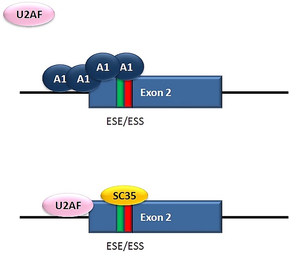 ВИЧ — ретровирус, являющийся причиной развития СПИДа — образует единственную пре-мРНК, из которой далее посредством альтернативного сплайсинга образуется более 40 различных мРНК[40]. Равновесие между сплайсированными по-разному транскриптами обеспечивает образование мРНК, кодирующих все белки, необходимые для репликации вируса[41]. Один из по-разному сплайсированных транскриптов содержит транскрипт гена tat, у которого экзон 2 является кассетным, то есть может быть либо включён в итоговый транскрипт, либо не включён. Включение этого экзона регулируют репрессор сплайсинга hnRNP A1 и SR-белок SC35. В экзоне 2 имеет место перекрывание сайленсерной последовательности (ESS) и энхансерной последовательности (ESE) перекрываются. Если с ESS связывается репрессор А1, то он запускает кооперативное связывание молекул А1, закрывая 5'-концевой донорный сайт выше экзона 2 и препятствуя связыванию U2AF35 с полипиримидиновым трактом. Если SC35 связывается с ESE, то он препятствует связыванию А1, и 5'-донорный сайт остаётся доступным для сплайсосомы. Конкуренция между репрессором и активатором приводит к образованию РНК, соответственно содержащей или не содержащей экзон 2[40].