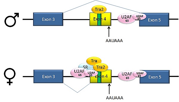 В описанном примере имеет место альтернативный сплайсинг по типу пропуска экзона. Интрон, лежащий выше экзона 4, содержит полипиримидиновый тракт, который не вполне удовлетворяет консенсусной последовательности сплайсинга, поэтому белки U2AF в отсутствие активаторов сплайсинга связываются с ним плохо. По этой причине у самцов этот 3'-акцепторный сайт сплайсинга не используется. У самок, однако, присутствует активатор сплайсинга Transformer (Tra). Этот белок связывается с SR-белком Tra2 (который образуется у обоих полов и связывается с ESE в экзоне 4) и совместно с ещё одним SR-белком, dsxRE, формирует комплекс, который содействует связыванию белков U2AF со слабым пиримидиновым трактом. U2 рекрутируется к соответствующей точке ветвления, и в результате происходит включение экзона 4 в состав зрелой мРНК[36][37].