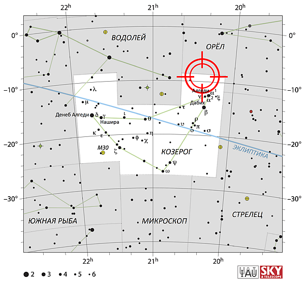 Радиант Альфа-Каприкорнид располагается на границе созвездий Козерог (лат. Capricornus — отсюда и название потока) и Орёл, около звёзд α1 и α2 Козерога, составляющих оптически-двойную звезду (рис. 3). Радиант очень нечёткий, рассеянный, что может указывать на сложную структуру данного метеорного потока, состоящего из нескольких меньших потоков. Экваториальные координаты усреднённого радианта на небесной сфере: прямое восхождение α = 306,7° (20h 27m), склонение δ = –8,3°[2]. Суточное смещение радианта по прямому восхождению составляет Δα = +0,9°, по склонению Δδ = +0,3°[4].