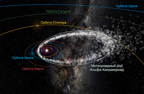 Альфа-Каприкорниды возникают во время ежегодного прохождения Земли через метеороидный рой (рис. 4), расположенный вдоль орбиты с большой полуосью около 2,54 а. е., эксцентриситетом 0,774 и относительно небольшим наклоном к плоскости земной орбиты, равным 7,5°. Перигелий орбиты расположен на расстоянии 0,578 а. е. от Солнца[5][11]. Метеороиды роя обращаются по орбите вокруг Солнца в ту же сторону, что и Земля[12], вследствие чего их геоцентрическая скорость при вторжении в атмосферу Земли относительно невысока — всего лишь около 22—23 км/с[3][6][5][7][4][11].