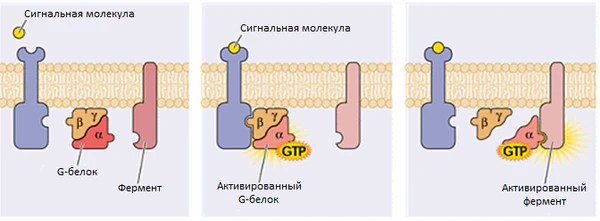 На клеточной поверхности связывание гормонов и нейротрансмиттеров с GPCR активирует рецептор, вызывая конформационные переходы, которые в свою очередь активируют G-белок, расположенный на внутренней поверхности клеточной мембраны. Активация G-белка заставляет ГДФ отсоединиться от его α-субъединицы, а её место занимает ГТФ. Связывание ГТФ вновь приводит к изменению конформации α-субъединицы, что позволяет связанному с рецептором гетеротримеру G-белка (неактивная форма) отсоединиться от него и диссоциировать на активную ГТФ-связанную α-субъединицу и βγ-гетеродимер. α-субъединица и βγ-гетеродимер активируют расположенные ниже эффекторы, таки как аденилатциклаза, фосфодиэстераза, фосфолипазу C и ионные каналы. Эти эффекторы в свою очередь повышают или понижают внутриклеточные концентрации вторичных мессенджеров, например: цАМФ, диацилглицерол, натрий или кальций, которые в конечном итоге приводят к формированию физиологического ответа, обычно через изменение транскрипции генов. Цикл завершается гидролизом связанной с альфа-субъединицей ГТФ до ГДФ, что приводит к реассоциации α-субъединицы и βγ-гетеродимера и последующему связыванию гетеротримера G-белка с рецептором[3]. Длительность сигнала от G-белок-связанного рецептора зависит от стабильности ГТФ-связанной α-субъединицы, которая может регулироваться через белки RGS (англ. regulator of G protein signalling) или посттрансляционными модификациями[4]. Существует несколько изоформ каждой субъединицы, многие из которых имеют несколько сплайсинговых вариантов, что в сумме делает возможным образование тысяч различных G-белков. Определённая комбинация субъединиц в каждом гетеротримере G-белка влияет не только на то, с каким рецептором он может связаться, но также и на активируемые им эффекторы, что делает возможным направленный физиологический ответ для каждого типа стимулов[5][6]. На одной или нескольких субъединицах G-белка имеют липидные модификации, которые направляют их в определённую область на цитоплазматической мембране и вносят свой вклад в белок-белковое взаимодействие. Семейство состоит из субъединиц Gα, которые являются слабыми ГТФазами. G-белки обычно классифицируют в соответствии с их первичной структурой и функцией их субъединиц Gα, которые у млекопитающих подразделяются на несколько подтипов: Gsα, Gqα, Giα, трансдуцин, густдуцин и G12α; существует также несколько классов α-субъединиц растений и грибов. Каждая α-субъединица состоит из двух доменов: ГТФ-связывающего домена и спирального вставочного домена[7]. ГТФ-связывающий домен гомологичен Ras-подобным малым ГТФазам, и включает в себя два региона переключения I и II, которые осуществляют изменение конформации в момент активации G-белка. Переключатели представляют собой петли α-спиралей с конформацией, чувствительной к гуаниновым нуклеотидам. Спиральный вставочный домен расположен между ГТФ-связывающим доменом перед переключателем I и присущ только G-белкам. Он функционирует как изолятор для гуанинового нуклеотида от взаимодействия с ГТФ-связывающим доменом и абсолютно необходим для диссоциации нуклеотида.