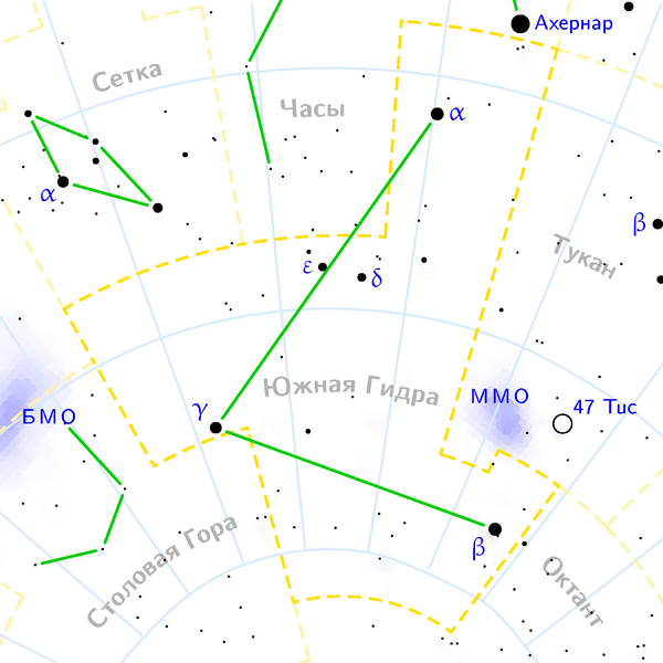 Альфа Южной Гидры (α Hyi, α Hydri) — вторая по яркости звезда в южном околополярном созвездии Южной Гидры. Видимая звёздная величина +2.9 (видна невооружённым глазом). Иногда можно встретить её неофициальное название Голова Гидры.[10] Не следует путать с Альфой Гидры (Альфард) из созвездия Гидры. Альфа Южной Гидры — одна из трёх звёзд в созвездии Южной Гидры, которые ярче четвёртой видимой звёздной величины. Эти звёзды легко обнаружить, так как они находятся южнее и западнее очень яркого Ахернара из созвездия Эридана.[11]