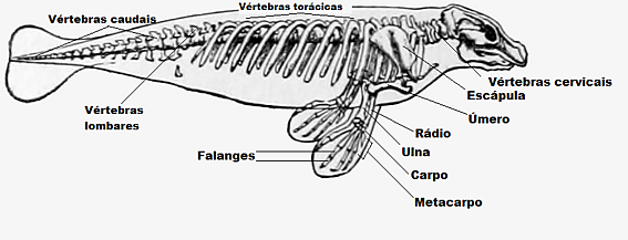 Лопатка амазонского ламантина узкая, формирует плечевой пояс, грудина состоит из одной кости и направлена назад боковым отростком. В состав передней конечности, то есть грудного ласта, входит плечевая кость, которая у этих животных тонкая и лёгкая, в отличие от других видов ламантинов, у которых она тяжёлая, длиной 22,3 см. К этим костям присоединяются другие короткие и почти одинаковые по размеру — лучевая кость и локтевая кость, к которым присоединены четыре и один элемент, составляющие запястье, соответственно. К запястью присоединены пять пястных костей, которые, в отличие от других видов рода Trichechus, длиннее, и, как уже отмечалось, на их концах отсутствуют когти. Длина черепа у взрослых особей может достигать 360 мм. Носовые кости имеют форму ромбических дисков толщиной от трёх до шести мм, вытянуты назад, а височные кости направлены в стороны. Некоторые отличия между черепом амазонского и африканского ламантинов: теменное отверстие отсутствует у амазонского ламантина, у которого также слабо развита сагиттальная шов и узкое большое затылочное отверстие, по сравнению с африканским ламантином.