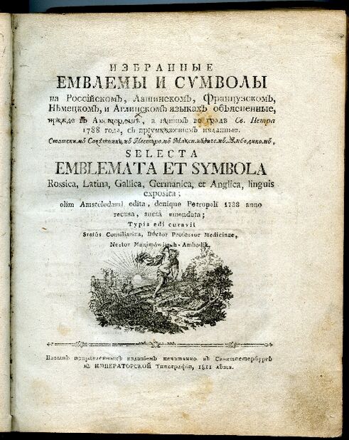 - Амбодик-Максимович Н. М.. Емвлемы и символы избранные, на российский, латинский, французский, немецкий и аглинский языки преложенные, прежде в Амстердаме, а ныне во граде св. Петра напечатанные, умноженные и исправленные статским советником Нестором Максимовичем-Амбодиком. — СПб.: печатано в Императорской типографии, 1788. — Т. 1, 2. — LXVIII, 280 с.