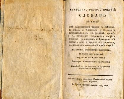 - Максимович-Амбодик Н. М.. Анатомико-физиологический словарь : В коем все наименования частей человеческаго тела, до анатомии и физиологии принадлежащия, из разных врачебных сочинений собранныя, на российском, латинском и французском языках ясно и кратко предлагаются, : С кратким описанием сих наук / Для пользы российскаго юношества в первое напечатанный трудами и иждивением Нестора Максимовича-Амбодика врачебной науки доктора и профессора повивальнаго искусства. — СПб.: Тип. Мор. шляхет. кадет. корпуса, 1783. — 160 с.