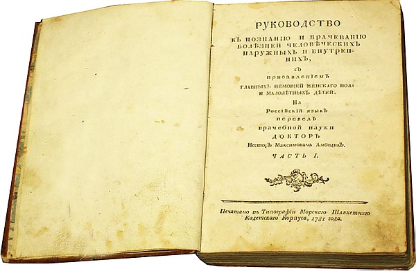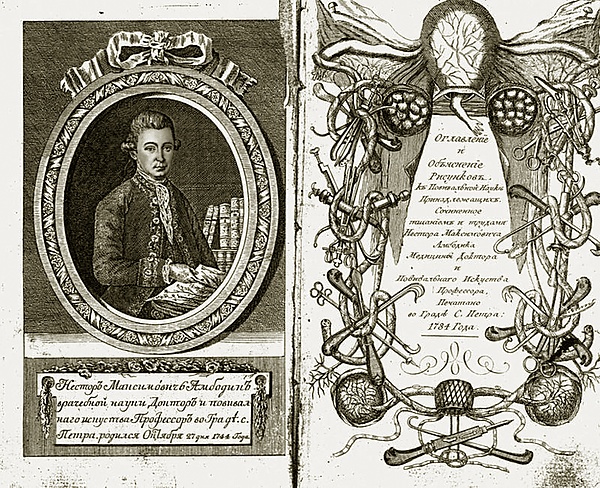 - Максимович-Амбодик Н. М.. Искусство повивания, или Наука о бабичьем деле : На пять частей разделенная и многими рисунками снабденная : В коей кратко но ясно толкуется: какое детородныя женские части имеют строение; коим образом надлежит пособлять беременным при родах, роженицам после родов, и новорождённым их младенцам во время младолетства; и какия именно болезни, как беременным чрез все время их беременности, и при родах: так и роженицам после родов, и новорождённым их младенцам обыкновенно приключаются. : Для пользы повивальных российских бабок и лекарей / Сочинил врачебной науки доктор, и повивальнаго искусства профессор Нестор Максимовичь-Амбодик.. — СПб.: Печатано в Императорской типографии, 1784-1786. — Т. 1—6. — (В качестве прилож. в части тиража к ч.6 присоединено с отдельным титульным листом и паг. переведенное Максимовичем-Амбодиком соч. Л. С .Сосерота: "Краткое испытание многих закоснелых мнений и предразсуждений. Касательно беременных жен, родильниц и новорождённых детей: со врачебным изследованием многих злоупотреблений, бывающих причиною уродов, человеческое племя обезображивающих: и с кратким объяснением средств, к отвращению сего служить могущих. Для пользы российских лекарей, и повивальных бабок. 2-м тиснением, много против прежняго исправленным. Изданное от Нестора Максимовича-Амбодика. Врачебной науки доктора и профессора повивальнаго искусства. Во граде с. Петра 1786 года". В ч. 6 имеется также грав. тит. л.: "Оглавление и объяснение рисунков к Повивальной науке принадлежащих. Сочиненное тщанием и трудами Нестора Максимовича Амбодика медицины доктора и повивальнаго искусства профессора. Печатано во граде с. Петра: 1784 года". В некоторых экз. этот лист вклеен в ч.1 перед общим тит. л , В ч.1 фронт. - портр. Н.М.Максимовича-Амбодика, выполненный офортом , На набор. тит. л. ч.6 указана тип.: Печатано в Императорской типографии , Авт. прилож. к ч.6 - г. Сосерот - назван в "Предъизвещении от издателя", пер. указан там же , Алфавитный список врачей, кои на разных языках писали вообще и частно о повивальной науке).
