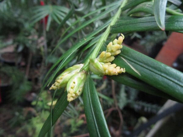 Микростробилы собраны в сложные, повисающие, серёжковидные собрания, до 3 см длиной, расположенных по (1) 3—4 (6) на концах вегетативных побегов. Элементарные стробилы па очень коротких ножках, шаровидные, выходят по одному или по 2—3 из пазух редуцированных чешуи. Микроспорофиллы почти дорсивентральные, несут по (3) 4—5 свисающих микроспорангиев. Мегастробилы одиночные, простые, на длинной ножке (до 2 см), выходящей из пазухи обыкновенных зелёных листьев. Семязачаток прямой, почти шаровидный, окружен 5—6 парами килеватых чешуй. Ариллус вначале окружает семязачаток лишь у основания, затем облекает семя.