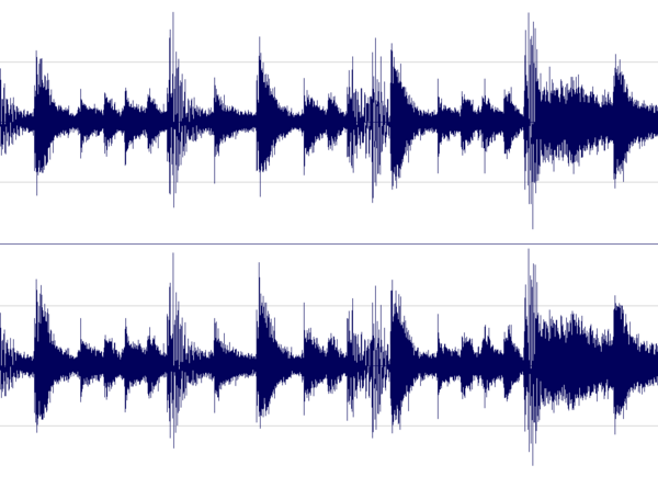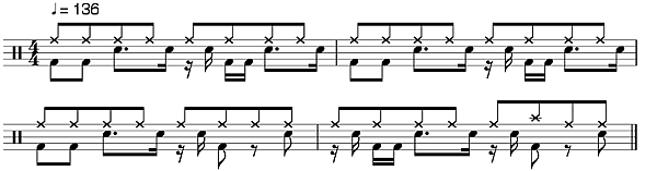 | Нотация LilyPond | \new DrumStaff { \tempo 4 = 136 \omit Score.BarNumber << \new DrumVoice { \voiceOne \drummode { \repeat unfold 28 cymr8 cymr cymc cymr cymr | } } \new DrumVoice { \voiceTwo \drummode { \repeat unfold 2 { bd8 bd sn8. sn16 r sn bd bd sn8. sn16 | } bd8 bd sn8. sn16 r sn bd8 r sn | r16 sn bd bd sn8. sn16 r sn bd8 r sn | \bar "|." } } >> } |
