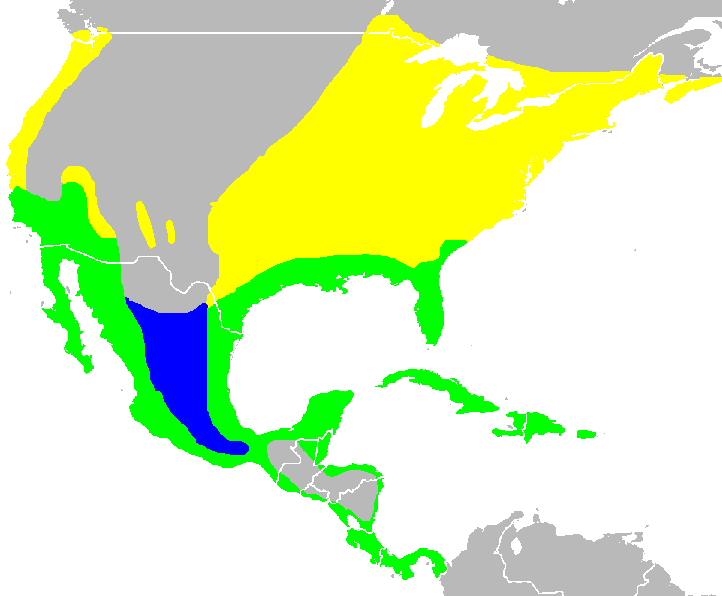 Широко распространена на территории Северной, Центральной Америке, встречается также в Южной Америке к северу от Колумбии и Венесуэлы. На севере ареал ограничен южными районами Канады. Одни популяции ведут оседлый образ жизни, другие мигрируют. В период размножения скапливаются в основном в восточной части Северной Америки к востоку от Великих равнин, хотя на западном тихоокеанском побережье также имеются отдельные популяции. Негнездящиеся птицы встречаются во внутренних областях Мексики и Центральной Америки, на юге американских штатов Аризона и Нью-Мексико[2][3]. Живут оседло на Антильских островах, побережье Мексики и Центральной Америки и в Южной Америке.