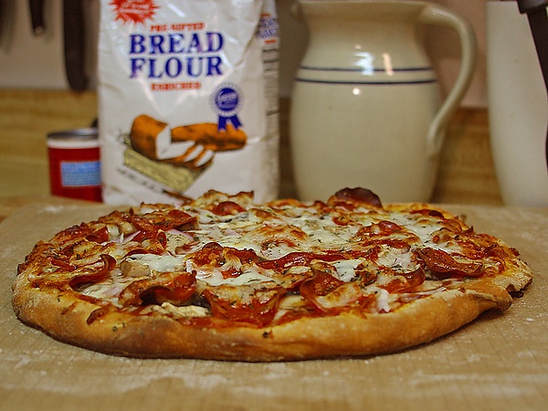 Американскую пиццу (особенно на тонком тесте) готовят из муки с очень высоким содержанием глютена (часто в нём также содержится 13-14 % белка). Её также используют для приготовления бейглов. Тесто из такой муки можно тонко растягивать и энергично замешивать, при этом не разрывая его. В отличие от итальянской пиццы, в тесто американской часто добавляют растительное масло или кондитерский жир. Его количество может варьироваться — от небольшого в относительно нежирном тесте (для рецепта по-ньюйоркски), до крайне большого (в рецепте по-чикагски, где тесто жарят во фритюре)[8].