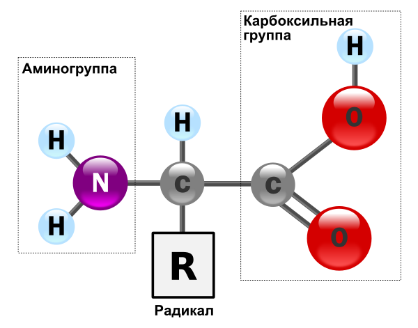 Аминокисло́ты (аминокарбо́новые кисло́ты; АМК) — органические соединения, в молекуле которых одновременно содержатся карбоксильные и аминные группы. Основные химические элементы аминокислот — это углерод (C), водород (H), кислород (O) и азот (N), хотя другие элементы также встречаются в радикале определенных аминокислот. Известны около 500 встречающихся в природе аминокислот (хотя только 20 используются в генетическом коде). [1] Аминокислоты могут рассматриваться как производные карбоновых кислот, в которых один или несколько атомов водорода заменены на аминогруппы.