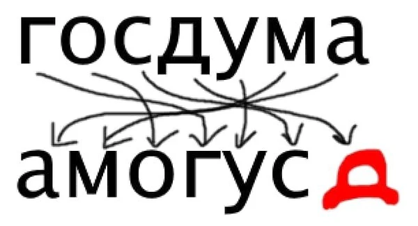 В Рунете возник пародирующий ребус-анаграмму мем о Госдуме с использованием достроенного мемного слова. Доктора филологических наук Л. Н. Ребрина и М. В. Милованова относят данный мем к истинным мемам, мемам-персонажам (оценка объекта критики — Госдумы — осуществляется посредством отождествления с прецедентным феноменом-персонажем с зафиксированным ассоциированным с ним отношением/признаком), мемам-инновациям (апелляция к современному прецедентному феномену), мемам с незначимой ролью фона, мемам-текстам (реплицируется мемное слово; тогда как в целом мем является интернет-мемом-изображением-текстом, поскольку воспроизводимыми узнаваемыми элементами выступают схематичное изображение космического человечка и мемное слово), мемам-мысли[4].