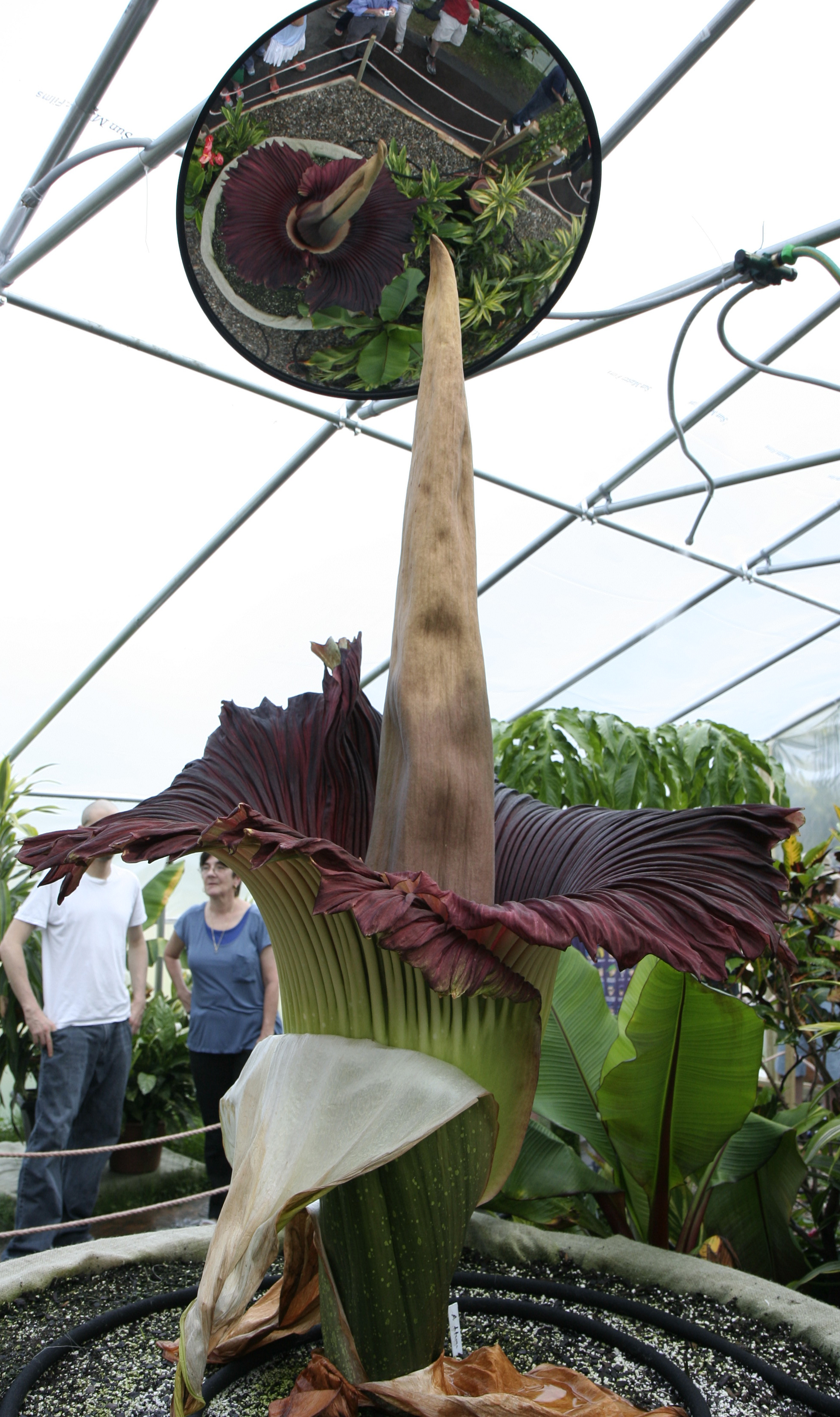 | 8 июля 2008 | Университет Коннектикута, Сторз, Коннектикут, США | Сдвоенные цветки этого экземпляра (13 месяцев в состоянии покоя без промежуточной стадии образования листьев, возможно, впервые) в итоге достигли высоты 70.5 дюймов (около 1.79 м), крупнейшее соцветие, выращенное в данном университете к этому времени. | |||||