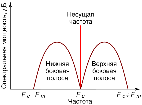 Радиосигнал состоит из несущего колебания и двух так называемых боковых полос, боковые полосы имеют частоту, отличную от . Для синусоидального сигнала, использованного в качестве примера здесь, боковые полосы представляют собой синусоидальные сигналы и их частоты равны и .