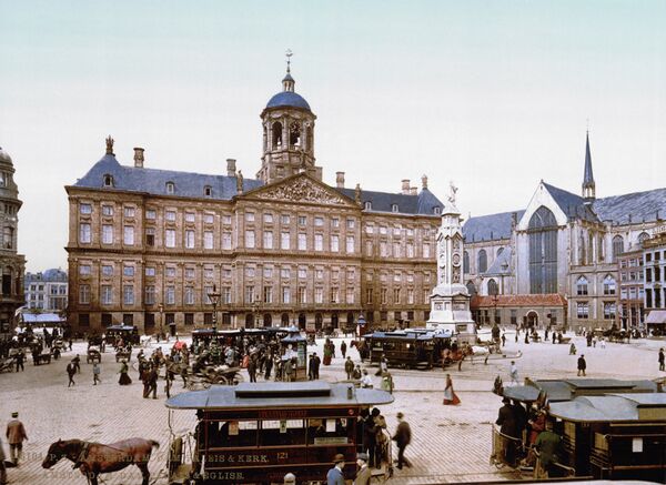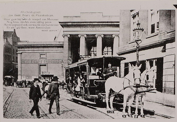 В Амстердаме трамвайное движение было начато 3 июня 1875 года. Конечно, это была конка, и частная фирма называлась «Амстердамское предприятие омнибусов» (Amsterdamsche Omnibus Maatschappij, AOM). Первый маршрут конки в Амстердаме соединил площадь Ляйдспляйн (Leidseplein) с кварталом Плантаж (Plantage). В последующие 25 лет было открыто ещё 15 линий, соединивших центр города с другими его районами. Ширина колеи была 1422 мм.