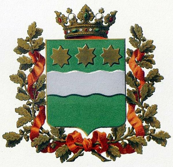 Описание герба: «В зелёном щите серебряный волнообразный пояс, сопровождаемый во главе щита тремя золотыми о восьми лучах звёздами. Щит увенчан древней Царской короной и окружён золотыми дубовыми листьями, соединёнными Александровской лентой».