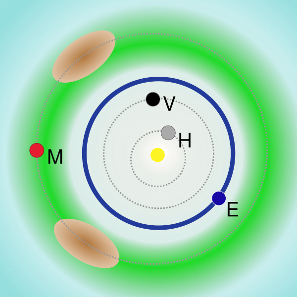 - Астероид должен приближаться к Земле на расстояние менее 0,3 а. е. Другими словами, он должен подходить к земной орбите ближе, чем любая крупная планета. Ближайшей к Земле планетой является Венера, которая в моменты наибольших противостояний сближается с ней до дистанции 0,27 а. е., а это значение для удобства округляется до 0,3 а. е. Поскольку орбита амуров находится снаружи орбиты Земли, то полученное расстояние используется для ограничения распространения орбит астероидов с внешней стороны земной орбиты и в сумме со значением большой полуоси составляет 1,3 а. е. ( q < 1,3 а. е.). За пределами 1,3 а. е. располагаются тела, относящиеся уже к группе астероидов, пересекающих орбиту Марса. При этом важно понимать, что так как амуры имеют довольно вытянутые орбиты, то практически все они, так или иначе, при приближению к афелию своей орбиты, пересекают орбиту Марса, хотя и не относятся к этой группе.