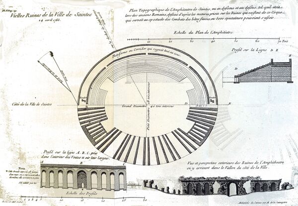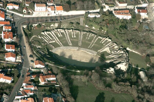 Строительство театра в городе Медиоланум Сантонум (Mediolanum Santonum), тогдашней столице римской провинции Аквитании, началось при императоре Тиберии (42 год до н. э. — 37 год н. э.) и закончилось около 40 года в правление императора Клавдия (10 год до н. э. — 54 год н. э.).