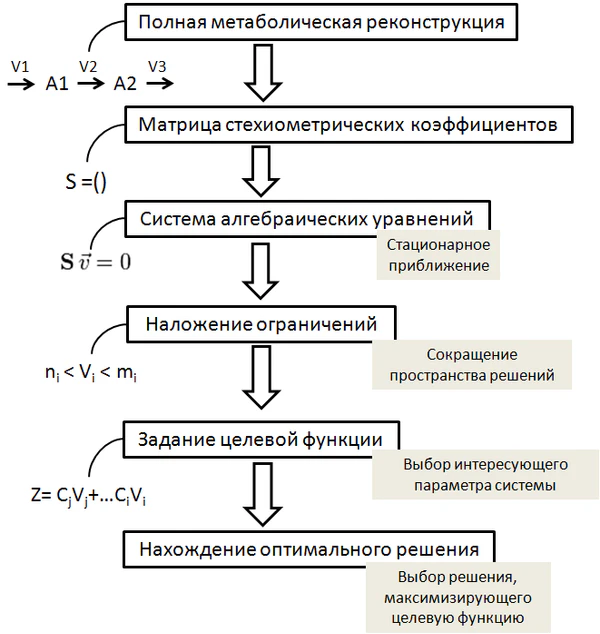 Говорят, что любое , удовлетворяющее уравнению обращает в ноль размерность пространства . Но в любой реалистичной метаболической модели количество реакций всегда больше, чем количество метаболитов (n > m). Другими словами, количество неизвестных больше, чем количество уравнений, следовательно, не существует однозначного решения такой системы, причем многие решения могут быть совершенно неподходящими с биологической точки зрения. Однако пространство решений можно ограничить, и искать решение, отвечающее некоторому критерию. Этот критерий задается так называемой целевой функцией, которая отражает некоторый параметр системы, и ищут решение, при котором эта функция имеет, например, максимальное значение. Кроме того, пространство решений сильно ограничивается наложением ограничений на каждый поток. Таким образом, например, можно рассчитать какая точка в пространстве решений соответствует максимальной скорости роста или максимальному выходу АТФ в определённом организме исходя из наложенных ограничений. (Рис. 1)