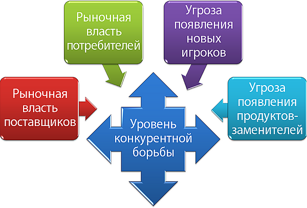 Методикой выделяются пять сил, которые определяют уровень конкуренции, и, следовательно, привлекательности ведения бизнеса в конкретной отрасли[1].