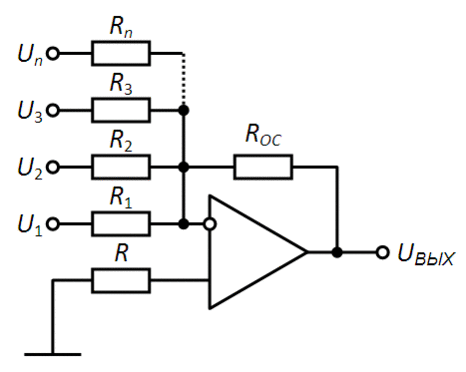 Таким образом, схема рисунке 1 выполняет над входными напряжениями операцию суммирования с отрицательными весовыми коэффициентами: