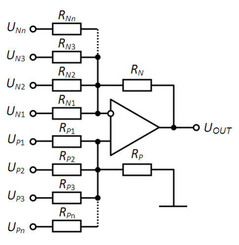 Таким образом, схема осуществляет сложение напряжений и вычитание напряжений с весовыми коэффициентами, равными: