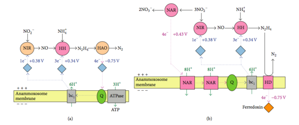 Согласно экспериментам с 15N, проведённым в 1997 году, в ходе анаммокса аммоний биологически окисляется до гидроксиламина, а в качестве возможного акцептора электронов выступает нитрит[25]. Считается, что электронные эквиваленты, необходимые для восстановления нитрита до гидроксиламина, образуются при превращении гидразина в молекулярный азот[26]. Предложено два возможных механизма этих реакций[26]. Согласно первому механизму, мембраносвязанный ферментный комплекс осуществляет превращение аммония и гидроксиламина в гидразин, который в периплазме окисляется до азота. В этот же момент цитоплазматическая сторона того же самого комплекса, который окисляет гидразин, и осуществляет внутренний перенос электронов. Второй механизм утверждает следующее. Аммоний и гидроксиламин превращает в гидразин мембраносвязанный ферментный комплекс, после чего гидразин окисляется до молекулярного азота в периплазматическом пространстве, а высвобожденные электроны через электронтранспортную цепь доставляются в цитоплазму к ферменту, восстанавливающему нитрит до гидроксиламина. Ещё нет ясности относительно того, происходит ли восстановление нитрита и окисление гидроксиламина в разных сайтах одного и того же фермента, или же эти реакции осуществляются двумя различными ферментными системами, соединёнными электронтранспортной цепью[26]. Микроорганизмы редко используют гидразин как промежуточное соединение в метаболизме азота[8]. Возможно, в нитрогеназной реакции именно он является связанным с ферментом промежуточным соединением[27].
