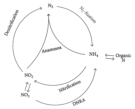 Далее остатки аммония и нитрит в ходе анаммокса, осуществляемого второй группой бактерий, превращаются в нитрат и молекулярный азот (выход около 15 %, не показано):