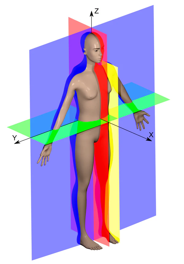 Отношение тела к главным плоскостям проекции важно в таких системах медицинской визуализации, как компьютерная и магнитно-резонансная томография, позитронно-эмиссионная томография. В таких случаях тело человека, находящегося вертикально в анатомической стойке, условно помещается в трёхмерную прямоугольную систему координат. При этом плоскость YX оказывается расположенной горизонтально, ось X располагается в переднезаднем направлении, ось Y идёт слева направо или справа налево, а ось Z направляется вверх и вниз, то есть вдоль тела человека.