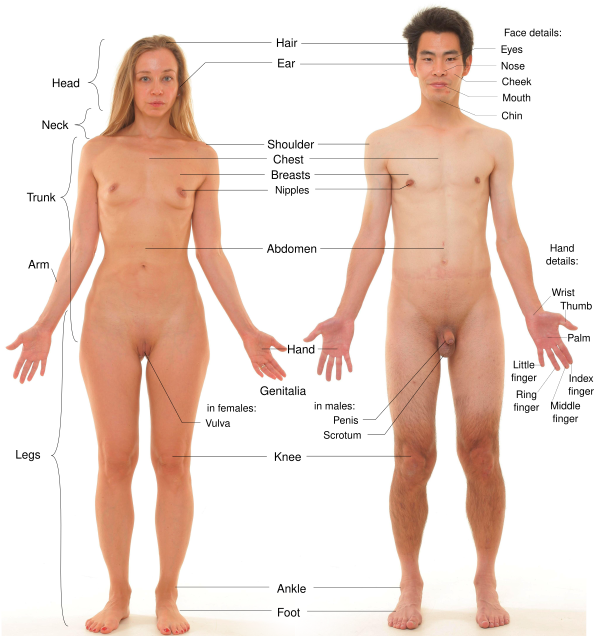 Спереди туловище делится на грудную клетку (thorax) и живот (abdomen). Спина как общая область называется dorsum или дорсальная область, а нижняя часть спины — lumbus или поясничная область. Лопатки (scapula) образуют лопаточную область, а грудина (sternum)— стернальную область. Брюшная область располагается между грудью и тазом. Грудь также называется областью молочной железы, подмышка — axilla или axillary, а пупок — umbilicus или umbilical. Таз — это нижняя часть туловища между животом и бёдрами. Пах (inguinale) — место, где бедро соединяется с туловищем, называется ингвинальная область[1].