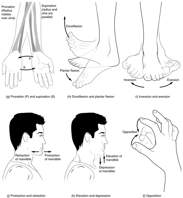 Типы движений обычно парные, при этом одно движение противоположно другому. Все движения тела описываются относительно анатомического положения[11].