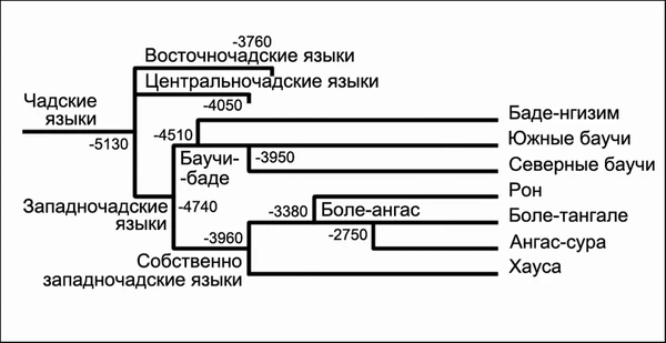 На схеме Г. С. Старостина (2010), которую приводит В. Блажек в своей статье Afro-Asiatic linguistic migrations: linguistic evidence, показано время разделения ветвей, подветвей и групп чадских языков. Согласно этой схеме, опирающейся на данные лексикостатистики, наиболее близкими к ангасским языкам являются языки боле-тангале — их распад произошёл около 2750 г. до н. э., разделение языков боле-ангас и языков рон произошло в 3380 г. до н. э., отделение группы хауса от всего остального собственно западночадского ареала (потомками которого являются языки рон, боле-тангале и ангасские) произошло около 3960 г. до н. э.[21]