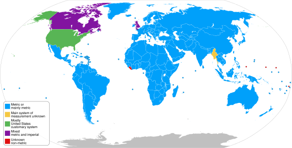 По данным ЦРУ, в июне 2009 года Мьянма была одной из трех стран, которые не приняли метрическую систему СИ в качестве своей официальной системы мер и весов[71]. Переход на метрическую систему начался в 2011 году[72]. Правительство Бирмы поставило цель перейти на метрическую систему к 2019 году при помощи Немецкого национального метрологического института[73].