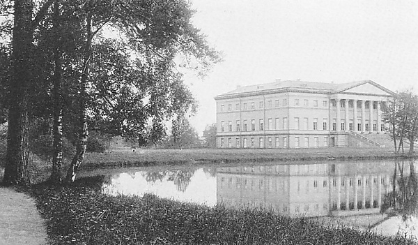 Посланники с семьями и свитой, а также представленные ко двору иностранцы получают квартиру и стол за счет императора. Для этой цели отведено обширное и изящное здание, называемое Английским дворцом. Это здание расположено в четверти мили от императорского дворца посереди прекрасного парка, разбитого в английском стиле и оживленного прудами и ручейками. Обилие воды и холмистая, столь редкая в окрестностях Петербурга местность придают много прелести этому парку.