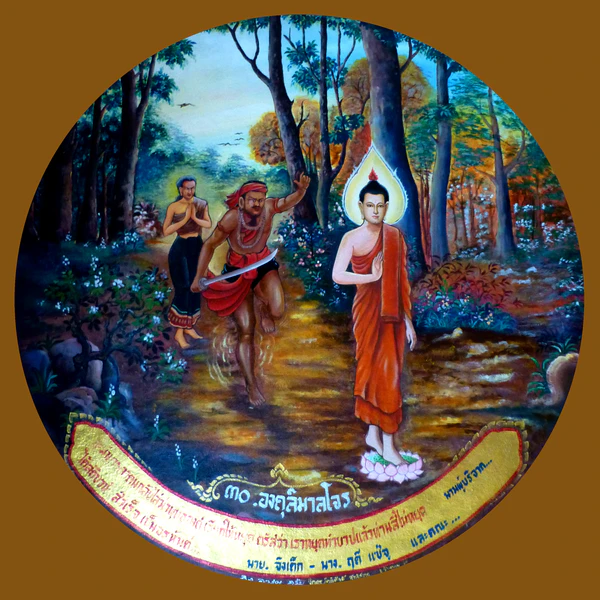 Будда отправился наперехват Ангулимале[19], хотя местные жители отговаривали его[16][41]. На дороге через лес Ангулимала сначала увидел свою мать[1]. Согласно некоторым версиям, он примирился с ней и она дала ему пищу[7]. Однако после некоторого раздумья он всё же решил сделать её своей тысячной жертвой. В этот момент он заметил Будду и вознамерился убить его. Достав свой меч, разбойник побежал вдогонку, но, несмотря на то, что Будда шел медленно, убийца никак не мог его настигнуть[1]. Сверхспособности Будды (пали iddhi, санскр. ṛddhi) поразили Ангулималу[34][7]: в одном из источников говорится, что Будда сжимал и расширял землю, на которой стоял, сохраняя таким образом дистанцию с преследователем[13]. Растерявшись, Ангулимала закричал: «Стой!», но Будда ответил: «Я уже стою, остановиться должен ты». Этот разговор стал поворотным моментом в судьбе Ангулималы[1][42]. Ангулимала попросил объяснить, что это значит, тогда Будда сказал:[43]