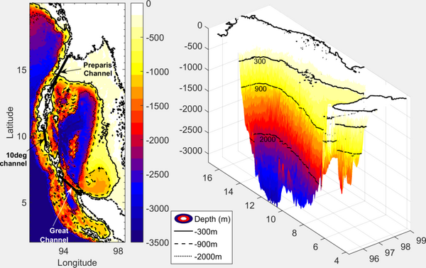 Западная граница Андаманского моря отмечена вулканическими островами и морскими горами, с проливами или проходами переменной глубины, которые контролируют вход и выход воды в Бенгальский залив. Глубина воды резко меняется на коротком расстоянии в 200 км по мере продвижения от Бенгальского залива (глубина около 3500 м) к окрестностям островов (до глубины 1000 м) и далее в Андаманское море. Обмен водой между Андаманским морем и Бенгальским заливом осуществляется через проливы между Андаманскими и Никобарскими островами. Из них наиболее важными проливами (с точки зрения ширины и глубины) являются: Preparis Channel (PC), Ten Degree Channel (TDC) и Great Channel (GC). PC является самым широким, но самым мелким (250 м) из трёх проливов и отделяет юг Мьянмы от северного Андамана. TDC имеет глубину в 600 м и находится между Малым Андаманом и Кар-Никобаром. GC имеет глубину в 1500 м и отделяет Большой Никобар от Банда-Ачеха.