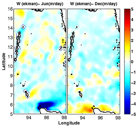 Влияние ветрового напряжения на поверхность океана объясняется с помощью завихренности ветрового напряжения. Чистая дивергенция воды в смешанном слое океана приводит к откачке Экмана[27]. Сравнение между двумя сезонами показывает очень сильную отрицательную скорость откачки более 5 м в день вдоль северного побережья Индонезии с мая по сентябрь (показано здесь, июнь). Это указывает на вероятную тенденцию прибрежного нисхождения летом. Также наблюдается, что в этом районе развивается слабая, но положительная скорость откачки (менее 3 м в сутки) в устье GC зимой (здесь, в декабре).