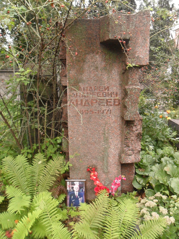 Похоронен на Новодевичьем кладбище в Москве. Согласно воспоминаниям Анастаса Микояна, не хотел быть похороненным в Кремлёвской стене[15]. Могила на первом участке. Напротив могилы Андреева находится могила его жены Доры Хазан-Андреевой.