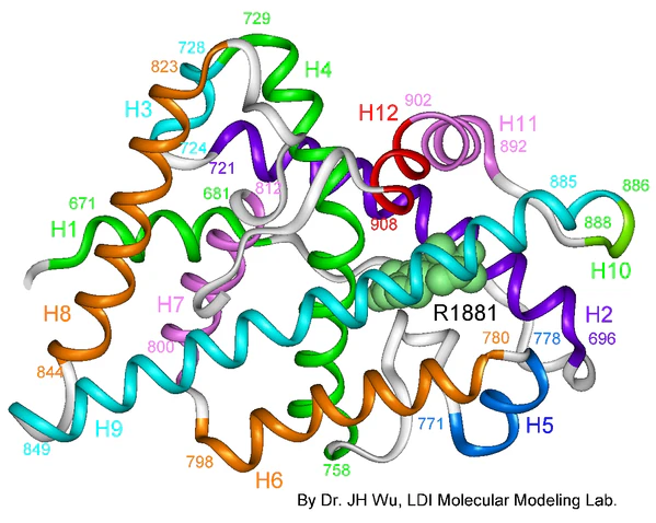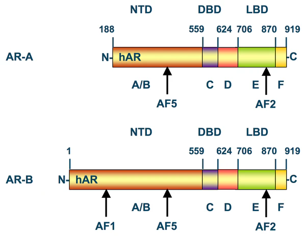 NTD — наименее консервативный домен AR; доля совпадения аминокислотных остатков между NTD AR человека и крысы составляет всего лишь 20 %[14].