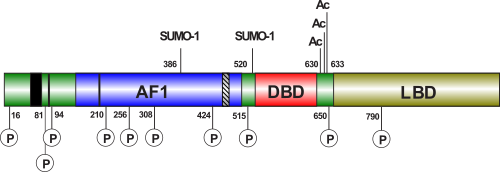 Посттрансляционные модификации андрогенового рецептора. Показаны сайты фосфорилирования (Р), сумоилирования (SUMO-1) и ацетилирования (Ac)[17]