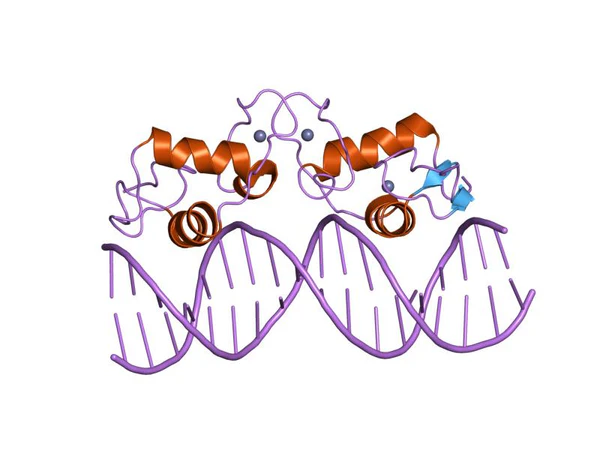 ДНК-связывающий домен (DBD) — наиболее консервативный домен AR: сходство между последовательностями аминокислотных остатков DBD человека и крысы достигает 100 %. Совпадение аминокислотных последовательностей между DBD AR и прогестеронового рецептора достигает 79 %, глюкокортикоидного рецептора — 76 % и эстрогенового — 56 %[14]. Он содержит 70 аминокислотных остатков и кодируется экзонами 2 и 3. Он характеризуется большой долей основных аминокислот и девятью консервативными цистеиновыми остатками. DBD имеет компактную глобулярную структуру, в которой хорошо различимы три субструктуры: два цинковых кластера и менее плотное упакованное С-концевое удлинение (CTE). В обоих цинковых кластерах содержится один атом цинка, который посредством координационных связей взаимодействует с четырьмя остатками цистеина. Каждый цинковый кластер с С-конца фланкируется α-спиралью. Два цинковых кластера структурно и функционально различны и кодируются разными экзонами. α-Спираль цинкового кластера, наиболее ближнего к N-концу, непосредственно взаимодействует с особыми последовательностями в ДНК. За специфическое узнавание этих ответных элементов в ДНК отвечают три ключевые аминокислоты (остатки глицина, серина и валина), в совокупности образующие так называемый Р-бокс (от «proximal» — ближний) (подробнее о взаимодействии AR с ДНК см.). Второй цинковый кластер, по-видимому, участвует в белок-белковых взаимодействиях (например, димеризации) и называется D-боксом (от «distal» — дальний)[7].
