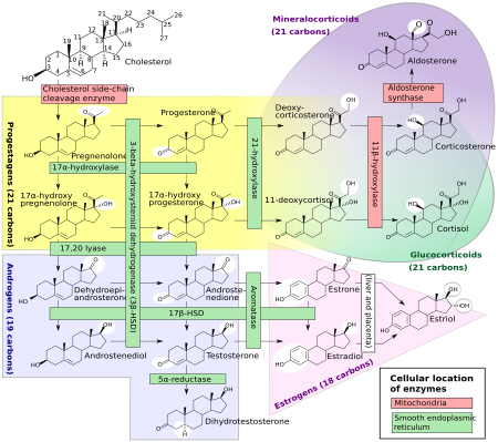 Стероидогенез, показывающий связь между несколькими андрогенами, находится внизу слева. Эстрон и эстрадиол, напротив, являются эстрогенами[3],