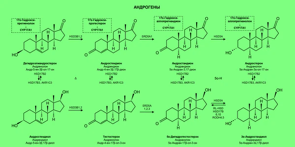- Андростендиол → Тестостерон → 5α-Дигидротестостерон1 → 3α-Андростандиол1