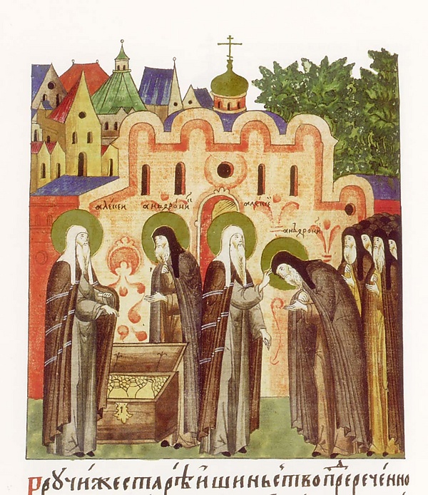Как-то Сергия Радонежского посетил митрополит Алексий, которому вдумчивый монах пришёлся по нраву, и он забрал его в Москву, определив его для устроения обители Всемилостивого Спаса в семи вёрстах от Кремля на Яузе. В 1361 году была воздвигнута церковь, освящённая митрополитом в честь Нерукотворного образа Спасителя, вокруг которой затем вырос монастырь[3].