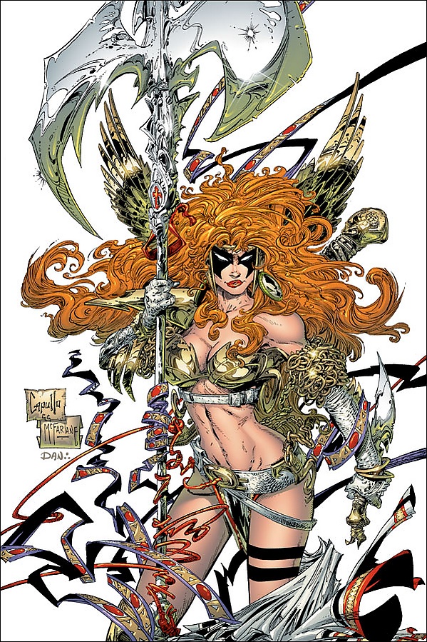В 1993 году Макфарлейн привлек к работе над «Спауном» Нила Геймана, а также Алана Мура, Дэйва Сима и Фрэнка Миллера. Каждый из них должен был написать по одному выпуску. В своем, девятом по счету, Гейман ввел таких персонажей, как Анжела, Коглиостро и Средневековый Спаун. Все трое и после этого продолжили появляться (и играть значительную роль) в серии, и выпускались в виде фигурок. Коглиостро играл важную роль в сюжете фильма 1997 года. Изначально Макфарлейн был согласен с тем, чтобы права на них хранил Гейман, но позднее заявил, что писателя лишь наняли выполнить работу, и поэтому все его творения принадлежат Макфарлейну, указывая на копирайты в девятом выпуске и отсутствие контракта, утверждающего обратное (некоторые считали, что эти действия были вызваны желанием получить все права на персонажей, используя для обмена персонаж Чудотворца). Макфарлейн также отказался платить Гейману отчисления со всех переизданий его работ и игрушек. В 2002 Гейман подал в суд и выиграл дело. Суд постановил, что, так как Гейман придумал персонажей, а Макфарлейн их нарисовал, права на них следует поделить поровну между обоими. Но теперь Анджела является частью вселенной «Marvel Comics». Её появление ожидается в финальном, 10-м выпуске серии Age of Ultron, а потом героиню ждет 5-й выпуск комикса Guardians of the Galaxy за авторством Брайана Майкла Бендиса, написанный в соавторстве с Нилом Гейманом.