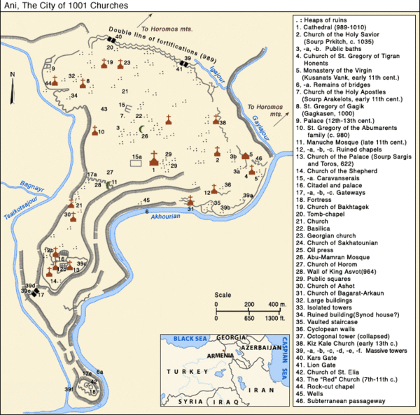 В период с 961 по 1045 год Ани был столицей Армянского царство Багратидов, границы которого охватывали значительную часть современных Армении и восточной Турции. Город стоит на треугольной возвышенности, образованной ущельем реки Ахурян и долиной Бостанлар, его местоположение служило естественной защитой. Ани называют городом 1001 церкви[10][11][12], через него пролегало несколько торговых путей, а его религиозные здания, дворцы и фортификационные сооружения были одними из самых технически и художественно совершенных в мире[13][14].