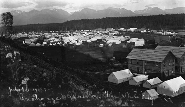 В конце XIX века, после открытия месторождений золота, скорость освоения Аляски увеличилась. В 1914 году территории в координатах современного Анкориджа были выбраны местом для штаб-квартиры компании по строительству федеральной железной дороги, которая вела от южного порта на полуострове Сьюард до золотых приисков вблизи Фэрбенкса на севере, через зоны месторождений каменного угля во внутренних областях Аляски. В июле 1915 года в районе штаб-квартиры, на берегу реки Шип-Крик (Ship Creek), вырос составленный безработными и авантюристами палаточный городок с одноимённым названием. В современных координатах штаб-квартира Аляскинской железной дороги (железнодорожный центр) находилась неподалёку от центра нынешнего Анкориджа[17].