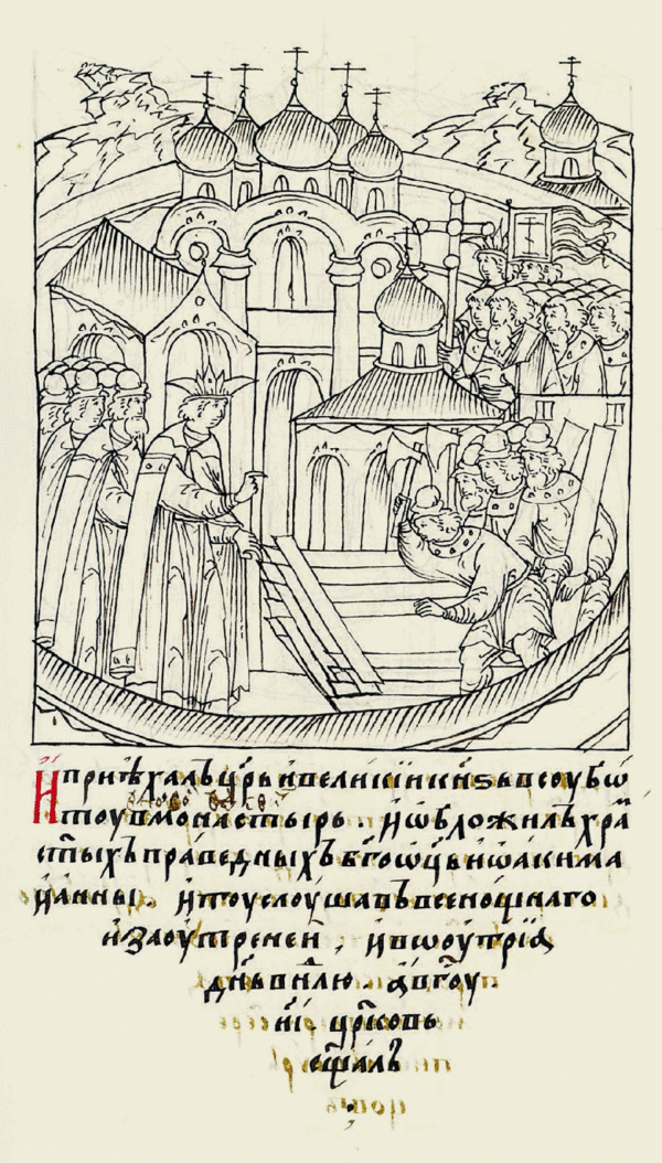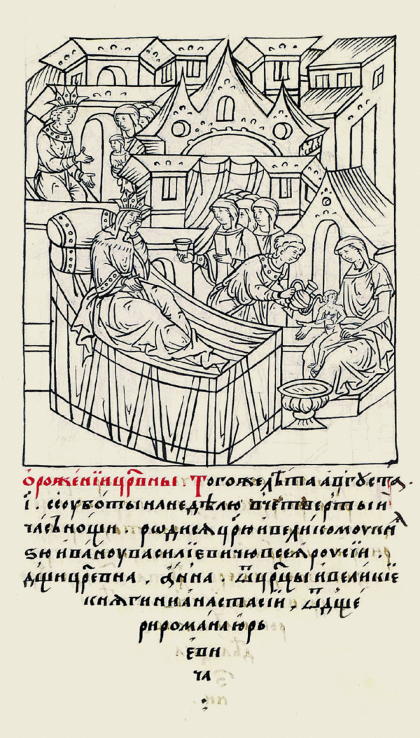 ...и как родилась царевна, Иоанн приехал в Новодевичий монастырь и обложил храм св. Иоакима и Анны, тут слушал всенощную и заутреню, утром церковь освещал и дочь свою крестил; восприемниками были два старца: Адриан из Андросовой пустыни и Геннадий из Сарайской; о крестных матерях не говорится (С. Соловьев. «История России с древнейших времен. 1584—1613 гг.»)